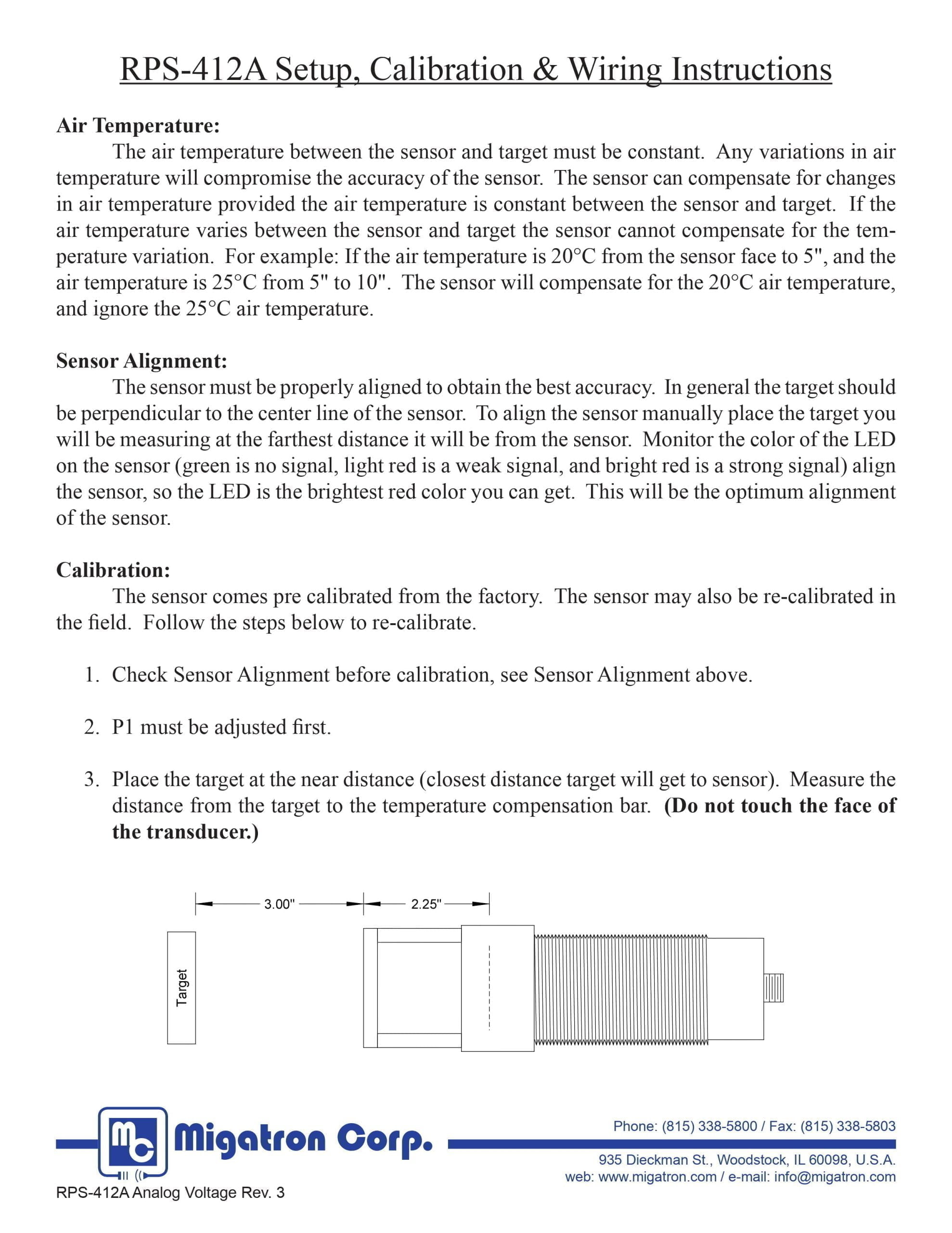 The RPS-412A is a high accuracy analog ultrasonic sensor (±0.002″ or 0.05% of range, which ever is greater, at 25°C) with a resolution of 0.0005″. The sensor monitors and compensates for air temperature 50 times per second, using the temperature compensation bar located in front of the transducer. The RPS-412A comes in two versions, analog current output or analog voltage output.