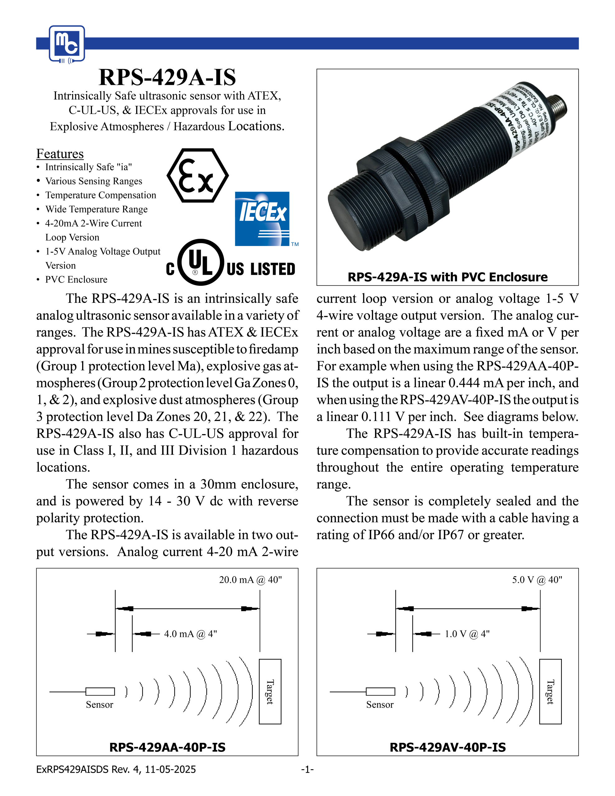 The RPS-429A-IS is an intrinsically safe analog ultrasonic sensor available in a variety of ranges. The RPS-429A-IS has ATEX & IECEx approval for use in mines susceptible to firedamp (Group 1 protection level Ma), explosive gas atmospheres (Group 2 protection level Ga Zones 0, 1, & 2), and explosive dust atmospheres (Group 3 protection level Da Zones 20, 21, & 22). The RPS-429A-IS also has C-UL-US approval for use in Class I, II, and III Division 1 hazardous locations. The sensor comes in a 30mm enclosure, and is powered by 14 – 30 V dc with reverse polarity protection. The RPS-429A-IS is available in two output versions. Analog current 4-20 mA 2-wire current loop version or analog voltage 1-5 V 4-wire voltage output version. The analog current or analog voltage are a fixed mA or V per inch based on the maximum range of the sensor. For example when using the RPS-429AA-40PIS the output is a linear 0.444 mA per inch, and when using the RPS-429AV-40P-IS the output is a linear 0.111 V per inch. See diagrams below. The RPS-429A-IS has built-in temperature compensation to provide accurate readings throughout the entire operating temperature range. The sensor is completely sealed and the connection must be made with a cable having a rating of IP66 and/or IP67 or greater.