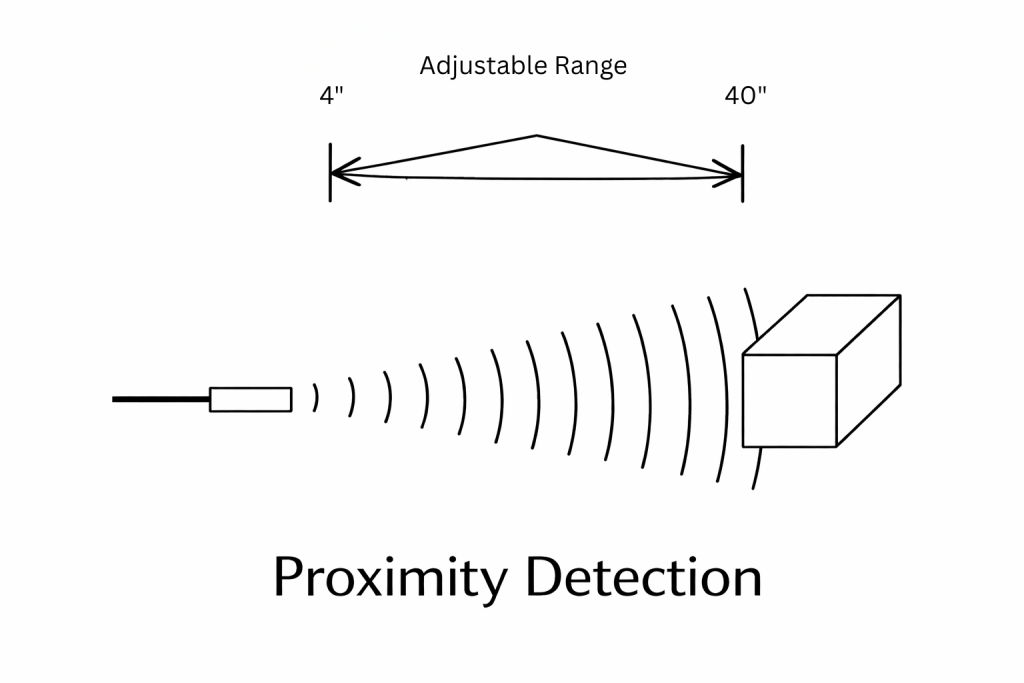 Proximity ultrasonic sensors are designed to detect the presence or absence of an object within a preset range. In the example below the maximum range can be adjusted from 4 to 40 inches.